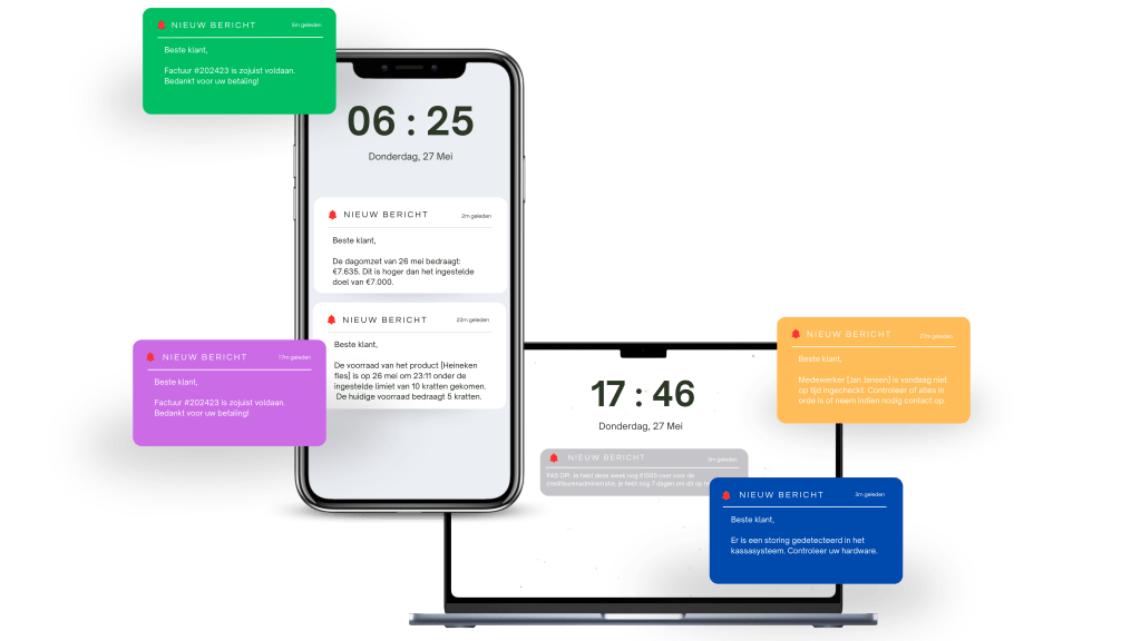 Monitor en beheer je hele bedrijf real-time, waar je ook bent. Met slimme alerts ben je direct op de hoogte van wat er speelt, zodat je altijd in controle bent en nooit voor verrassingen staat.