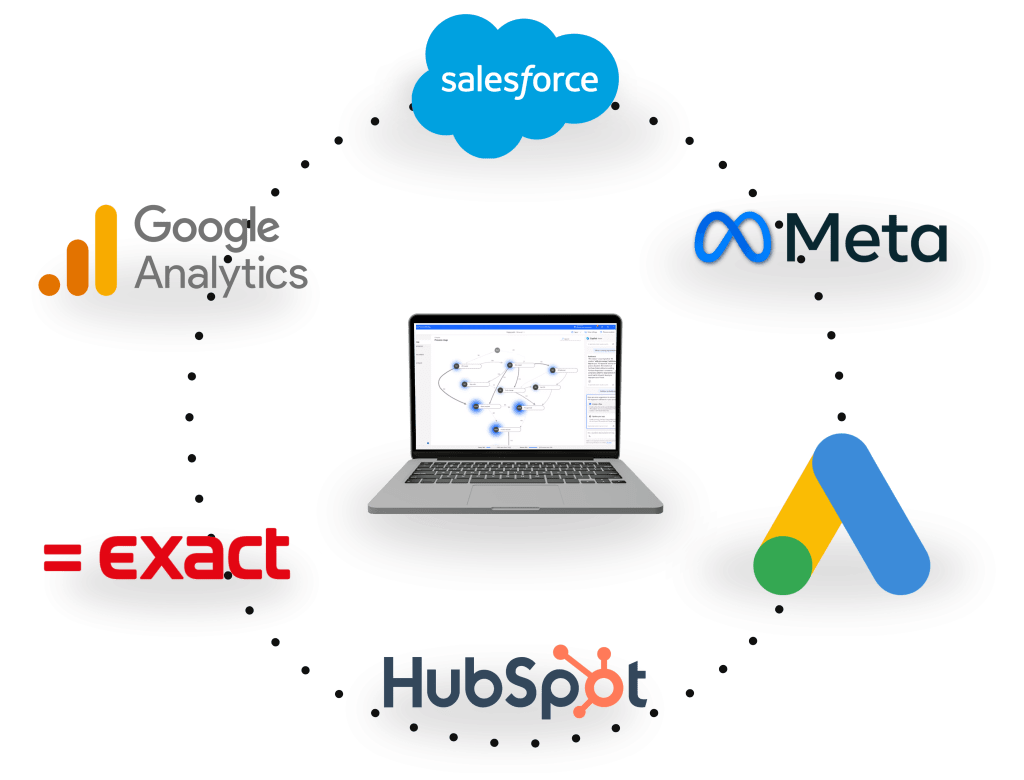 Wij koppelen onder andere met Exact Online, Salesforce, Google Analytics, Meta Business Suite, ActiveTickets, maar niet beperkt tot deze systemen. Via API’s of maatwerkoplossingen kunnen we vrijwel elk platform integreren dat toegang biedt tot de juiste data.
